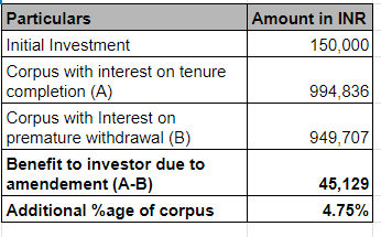 As per the new rules, your corpus would yield ₹9,94,836 assuming a pre-mature withdrawal is made in the month of November 2023.