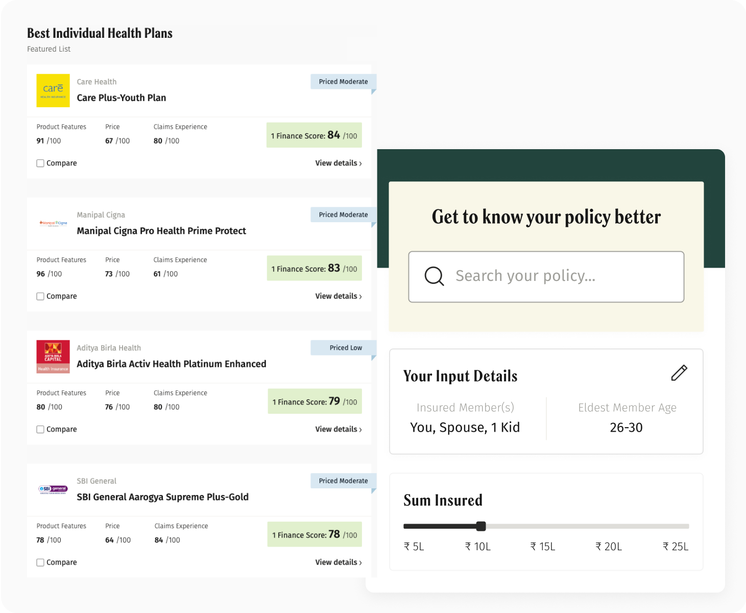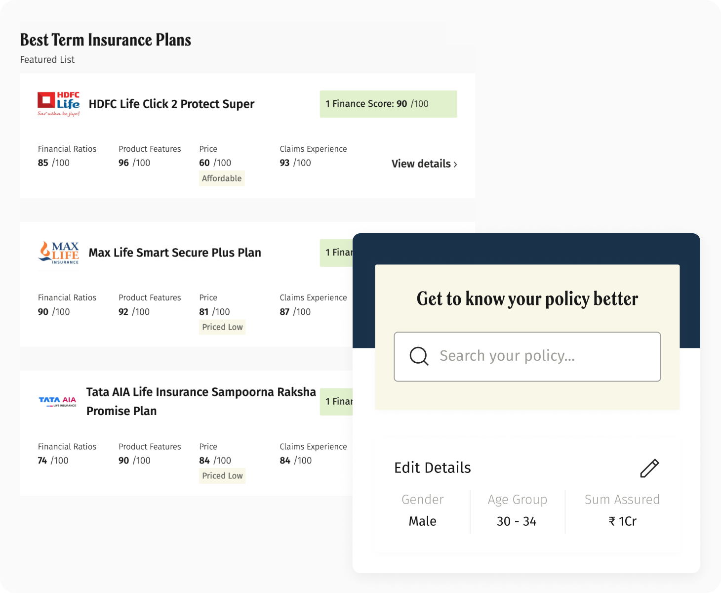 Our coverage recommendations are based on a detailed assessment of your financial parameters, including current lifestyle expenses, financial goals, dependents, retirement plans, and assets. This helps you secure the ideal coverage for your loved ones and prepares you for medical emergencies. Our advanced scoring and ranking model, represented by the “1 Finance Score,” guides you in making the best choices, ensuring unbiased advice that always prioritises your financial future.
