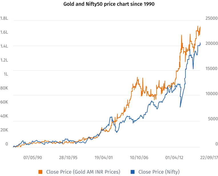 For instance, look at this chart. This shows you the INR price trajectory of Gold AM prices from the year 1990 till date vs Nifty 50.